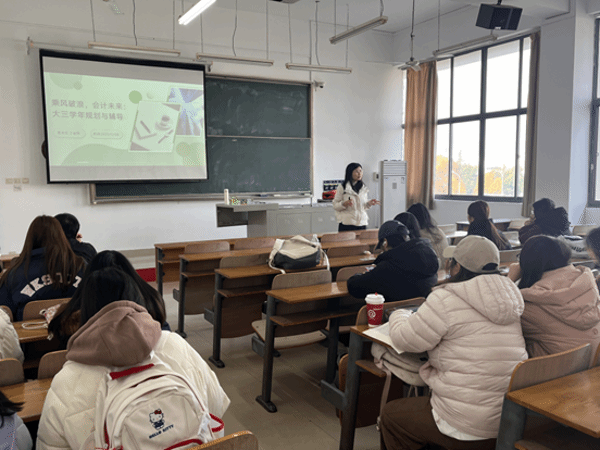 在未来路径抉择环节,丁老师详细解读了考研深造、考公入职、就业实践三大主流方向的核心要求与行动指南:考研同学需在大三下启动第一轮复习,聚焦择校与数逻、英语、专业课备考;考公同学要密切关注国考、省考时间节点,扎实准备行测与申论;就业导向的同学则应优先拿下初级会计证书,规划CPA/ACCA备考进度,同时精通Excel与财务软件,积极积累实习经验。此外,丁老师鼓励同学们积极参与创新创业大赛、“挑战杯”等赛事活动,组队时注重专业与能力互补,在实践中培养团队协作与创新精神;并倡导大家将志愿服务落到实处,主动参与校园公益与社会服务,以实际行动传递青年担当。