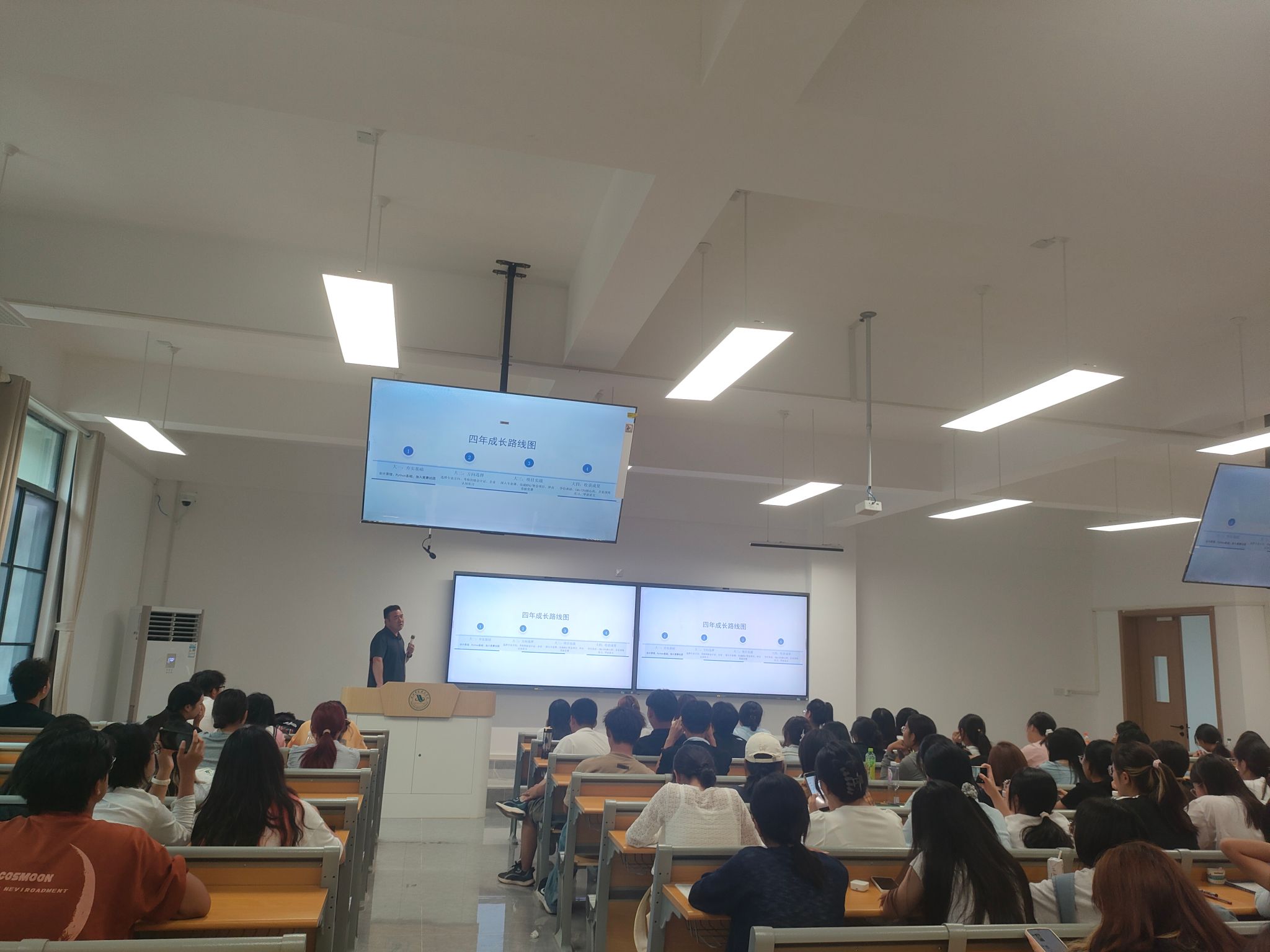 在介绍大学四年的成长路径时,林波老师系统梳理了各阶段专业课程的内容与目标,强调了考取初级会计证书的重要性,建议同学们把握先发优势,从大一开始积极备考,并可适时规划考取税务师、银行从业资格证等相关证书,号召大家尽早行动、持续积累。徐玄玄老师则鼓励同学们在专注学业与考证的同时,积极参与学科竞赛,拓展专业视野,全面提升综合能力。她还提醒同学们遇到困难及时与老师沟通,尽快适应大学学习与生活节奏。