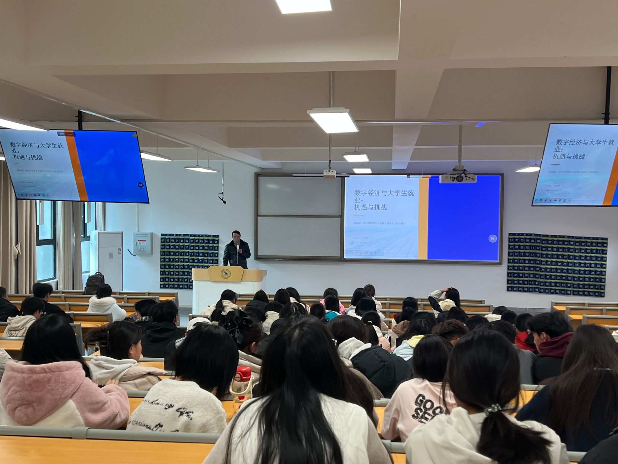 讲座内容涵盖数字经济发展趋势、新兴职业领域、就业市场结构变化以及大学生应具备的核心竞争力等多个方面,助力学生在数字经济浪潮中抢占先机、实现高质量就业。结合其深厚的学术造诣与丰富的实践经验,为同学们描绘了一幅生动的未来就业图景。他详细阐释了就业市场正在发生的结构性变化:传统岗位对数字技能的要求日益提高,平台经济、零工经济等新就业形态蓬勃发展,职业的边界正变得越来越模糊。整个讲座过程中,朱教授引用了大量鲜活的案例与前沿数据,内容充实,逻辑清晰,现场气氛热烈。