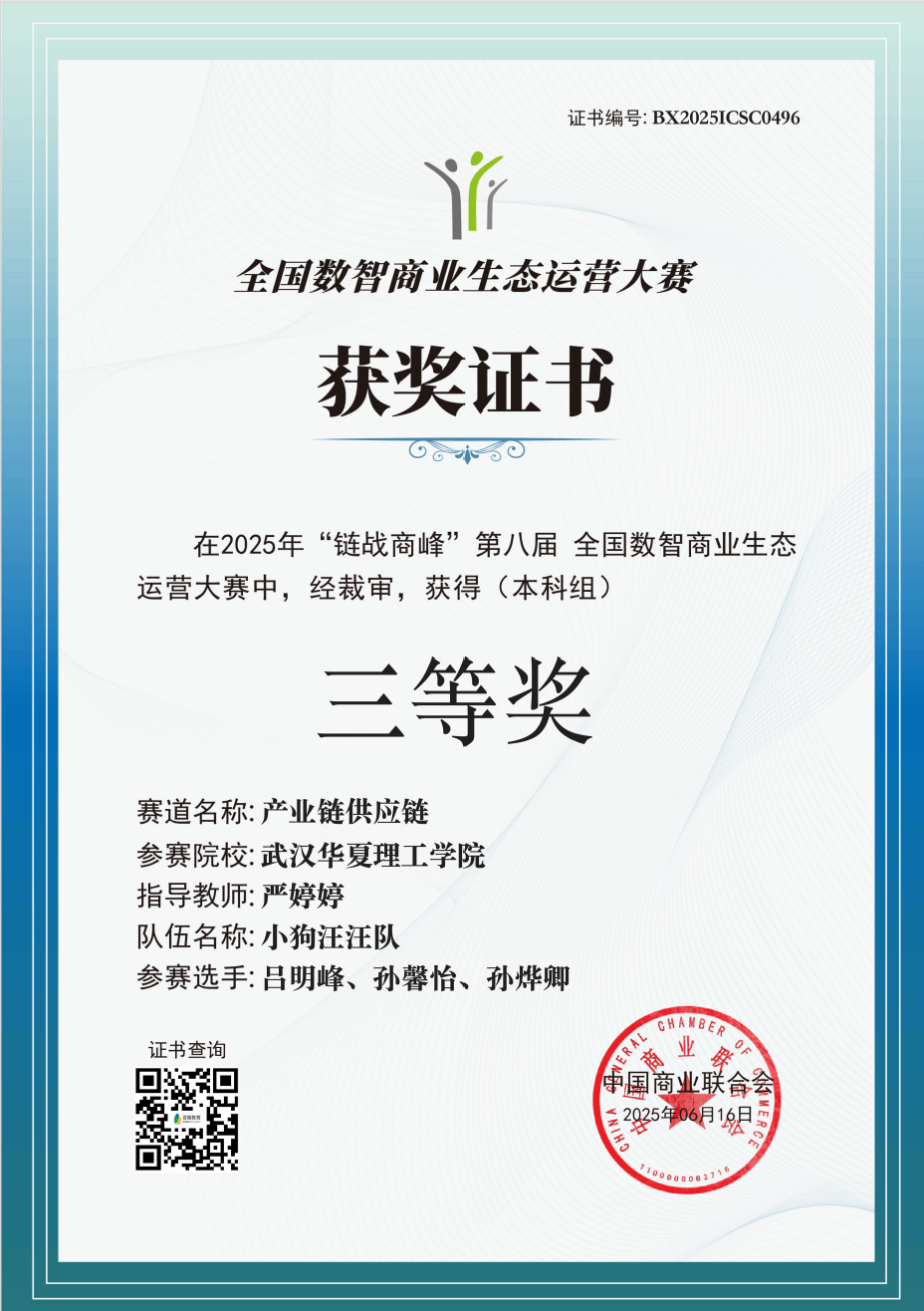 “从一次次破产到站上领奖台,离不开每一次的反思与调整,更离不开三人的分工协作与彼此信任。”团队成员表示,此次大赛不仅提升了他们的商业运营与数据分析能力,更深刻体会到供应链协同的重要性。未来,三人将把竞赛中积累的经验运用到学习与实践中,持续探索数智商业领域的无限可能。
