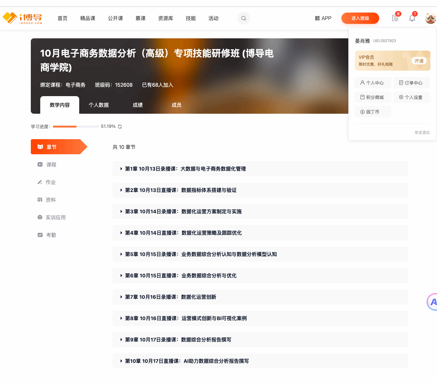 本次研修班课程体系严谨完整,堪称“数据驱动的电商运营全景课”。课程自10月13日至17日展开,采用“录播课夯实基础+直播课互动拔高”的混合教学模式。晏肖雅老师系统学习了涵盖大数据与电商数据化管理、数据指标体系搭建、数据化运营方案制定与实施、数据分析模型认知及优化策略等十大章节内容。