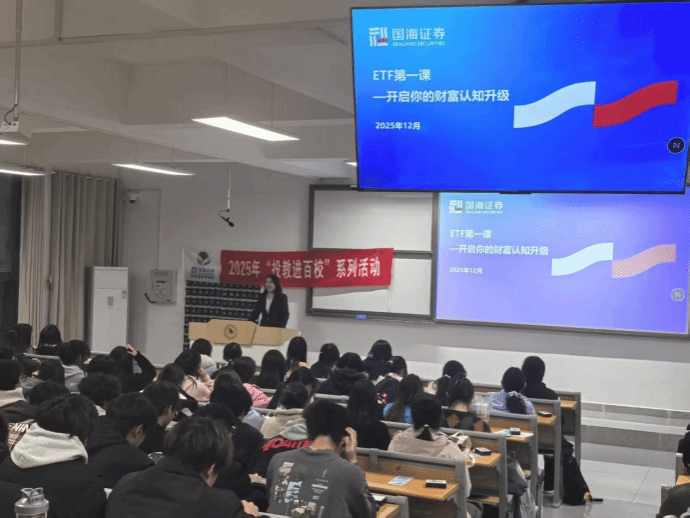 2025年12月11日晚,国海证券在武汉华夏理工学院梧桐湖校区成功举办了一场主题为“ETF第一课—开启你的财富认知升级与‘海E融杯’ETF融资融券模拟交易大赛介绍”的专题讲座。本次活动旨在面向经济与金融专业学生普及ETF基础知识与融资融券交易机制,引导大学生树立理性投资观念,并为即将启动的模拟交易大赛预热。