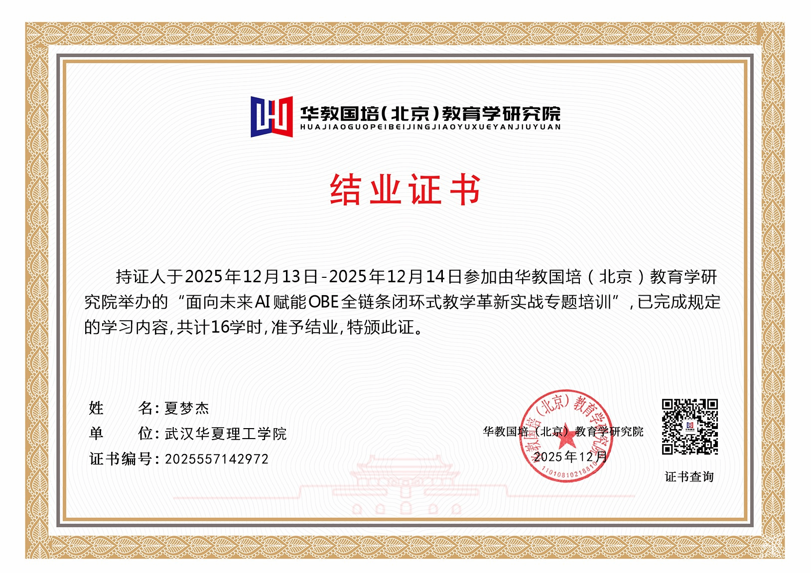 为深入践行国家教育数字化转型战略,深化成果导向教育(OBE)理念在教学中的实践应用,提升人工智能时代下的课程设计与教学创新能力,2025年12月13日至14日,大数据与电商系教师夏梦杰参加了由华教国培(北京)教育学研究院主办的“面向未来AI赋能OBE全链条闭环式教学革新实战专题培训”线上研修活动。