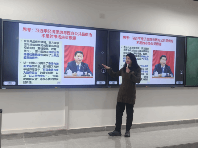 解析西方经济学市场失灵理论后,毛老师结合习近平经济思想中“有效市场与有为政府结合”的理论创新,对比中西方公共物品供给路径。她以美国铁路设施老化、公共资源供给不均为例,指出西方国家过度依赖市场,造成公共品供给不足、结构失衡;而我国通过政府主导、规划引领、财政保障,在高铁、通信、教育、医疗等领域实现公共物品高效供给。