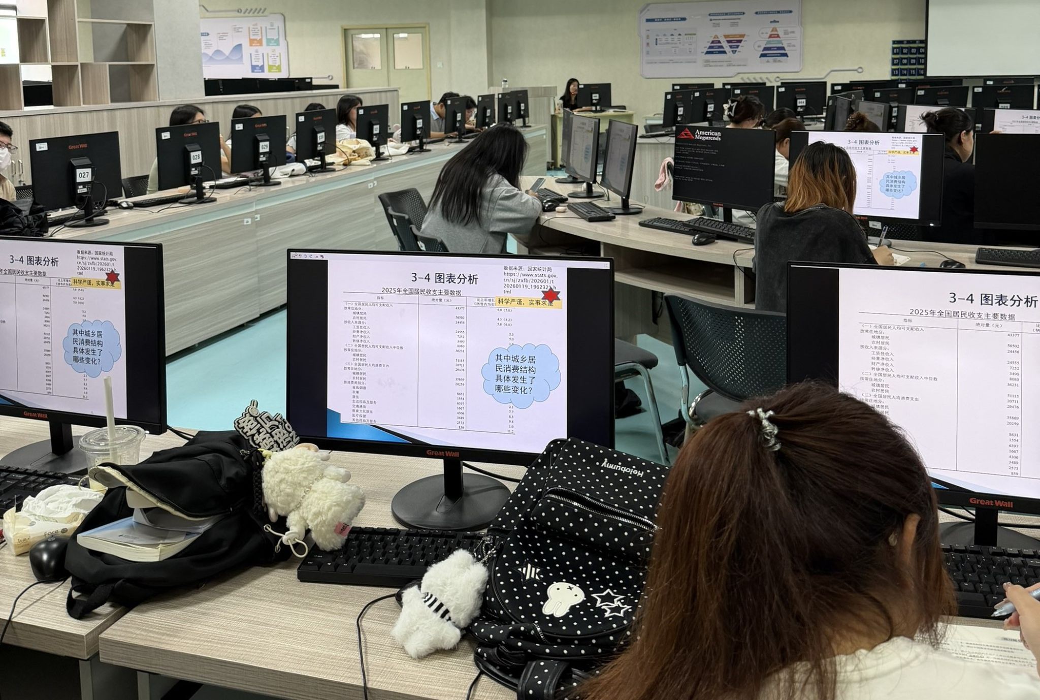 本次教学围绕“用民生数据讲好共同富裕故事”主题,将党的二十大精神、习近平经济思想同SPSS图表分析技能教学同频共振。课堂开篇,刘老师以国家统计局发布的2025年居民消费数据为切入点,提出“城乡居民消费结构发生了哪些变化?如何用图表科学呈现?”的思考问题,引导学生从恩格尔系数、消费升级、城乡差距等角度理解居民消费水平作为共同富裕成效指标的现实意义,明晰数据分析服务经济社会发展的应用价值。