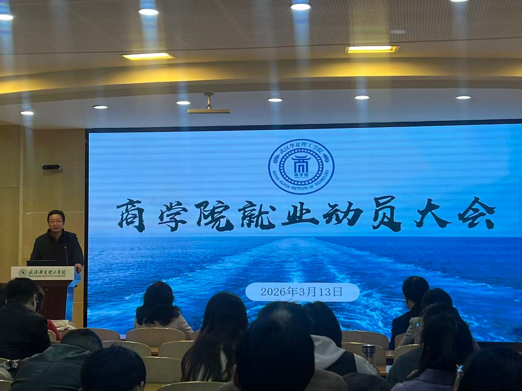 为全面落实学校毕业生就业工作部署,切实压实就业工作责任,全力保障2026届毕业生高质量充分就业,3月13日下午,武汉华夏理工学院商学院在2-201召开就业动员大会,专题部署2026届毕业生就业工作。学院院长程艳霞,党总支副书记孙文胜,副院长王艳、刘佳及全体教职工参会,会议由党总支副书记孙文胜主持。
