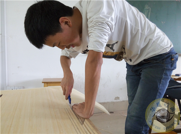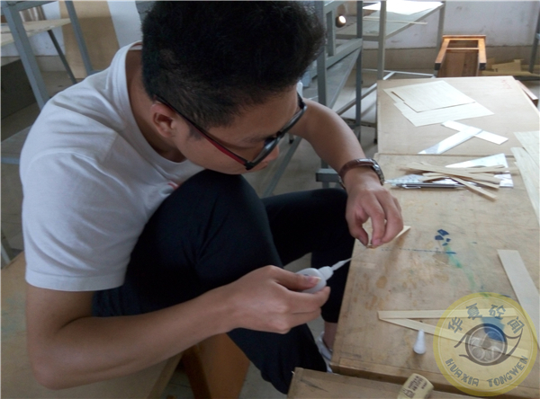 早上8点30分,在实验室中,已有两组参赛人员正做着模型。他们井井有条地计算着每一个公式,标记着每一个数据,每位成员都十分投入,认真地完成着每一道步骤。计算标记完后,土木1152班的徐庆元开始粘贴竹条,他用左手将竹条固定,用右手将502强力胶在固定部位倒入少许胶水,然后用拇指按住该部位,使其更加牢固。他不断重复着这个动作,直到把每个竹条都粘到坚固。后来,有更多的组员来到实验室制作模型。