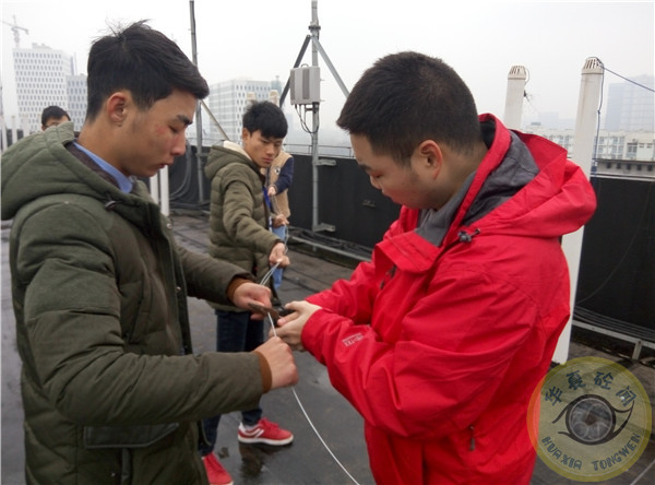 与此同时,“爱心晾衣绳”活动也在进行中。为方便寝室生活,我系调查到两栋宿舍楼楼顶铁架晾衣地方有限、空柱没有绳子,准备增加晾衣绳,为学生晾晒衣物提供方便。志愿者们拿好早已准备的绳子和铁丝来到两栋楼的顶楼平台,冒着寒风和细雨展开工作。他们将废弃的晾衣绳剪断并重新牵线,随即贴上青协和宿管会的标志。活动进行到10点,基本完成此次任务。