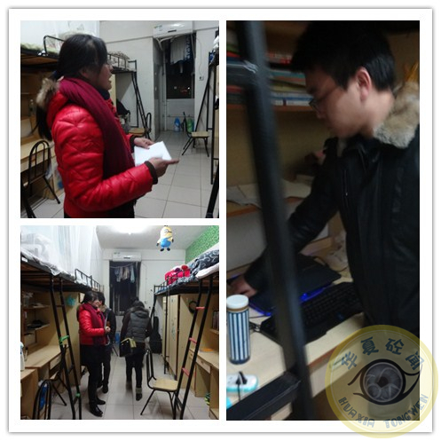 2014年12月15日晚,土木与建筑工程系学生工作办公室主任潘晶,学工办老师姚卓夫,杨志才,胡少梦,潘鹏飞,李敬,汤浩,李艳萍等一行8人对7号楼土木系学生寝室进行了综合性检查,此次检查历时一个多小时,检查内容涉及消防用电安全,寝室内务风貌等各个方面。对于在检查过程中发现的各类问题,学工办都进行了相应的记录。