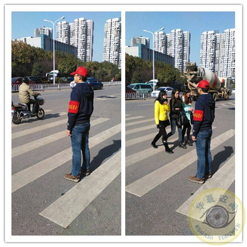 2014年12月16日中午,在武汉冬季温暖的阳光下,土木系青协的志愿者们在学校正门的马路口当起了“交警”,他们将维护行人车辆的交通顺畅,劝导人们文明过马路。