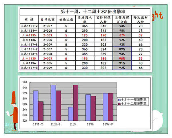 本学期开始,在自律联合会成员严谨的工作态度正直的工作作风,土木系早晚自习出勤率有了很大的改观。效果最明显的要数土木1135班了。