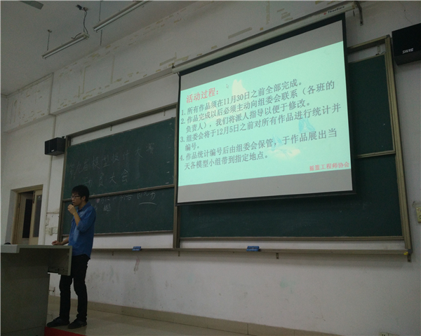 动员会上,宣传部部长胡坦和学术建设部副部长陈旋介绍了建模大赛的长远历史,紧接着,他们向全体学生详细介绍了模型制作的各种材料,向同学们展示了各届学长学姐们的各项创作,看到精致漂亮的建筑模型时,同学们惊叹不已。他们以专业的知识和个人的魅力,让学弟学妹们对建模大赛有了较深的了解,对建模大赛充满了激情与欲望。最后,学长向同学们介绍了参赛规则和方式并宣布大会结束。