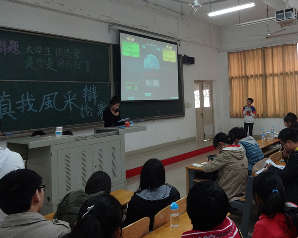 此次辩论围绕讨论“大学生谈恋爱是否因为寂寞”这一敏感的话题展开。针对当下大学生的情感问题,双方开始了精彩的辩论。正方经管系观点:大学生谈恋爱时因为寂寞。反方土木系则认为:大学生谈恋爱不是因为寂寞。第一环节开篇立论,正方辩手明确指出当今大学生因为寂寞而谈恋爱。而反方一辩则从个人和社会的角度来阐述大学生谈恋爱不是因为寂寞,具有很强的说服力。接下来的二辩环节中,双方互不相让,以极强的逻辑思维进行辩论。然而更加激烈的辩论却是在三辩,双方唇枪舍剑,旗鼓相当。正方三辩言辞犀利咄咄逼人,反方三辩也不甘示弱,辩论赛顿时进入白热化阶段。在三辩环节中台下响起了一阵又一阵雷鸣般的掌声,观众对本场友谊赛的热情极为高涨。在比赛过程中,反方三辩质问的那句:“请问你寂寞吗?”让台下观众笑翻了天。接着,正方三辩回答:“是的,我很寂寞,所以我谈恋爱。”因为正方反方这一问一答,为这场火药味十足的比赛增添不少乐趣。