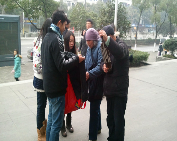 下午1时左右,十多名志愿者拿着由同学们捐赠的衣服从学校出发来到光谷广场,期望把衣物交给需要它们的人手上。刚下车就发现有一对老年妇女穿着单薄的衣物相互搀扶的走在路上,志愿者于是过去和他们交流,得知他们是河南人,儿子已经去世了,儿媳妇也走了,孙子体弱多病在老家,平时就住在武昌火车站,因为天气太冷了准备明天就回去。老奶奶说完当时就潸然泪下了。志愿者拿出一套适合老奶奶的衣服给她穿上,还把身上所有的零钱给他们了,他们连声说谢谢。