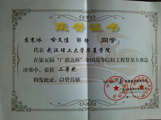 2012年第五届“广联达杯”全国高等院校工程算量大赛总决赛中,我院土木与建筑工程系工程管理专业2009级学生袁寒冰、喻文值、郭静三人组成的“华夏之星”团队,在朱韶茹、赫桂梅专业教师悉心的指导下荣获“全国高等院校工程算量二等奖”的佳绩。