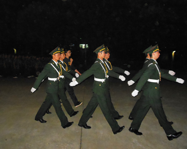 夜色中,华灯下,有着那么一群在校园中并不罕见的身影正在训练着。挺拔的军姿,闪亮的绿色军装,一切的一切都是那样的吸引着眼球。