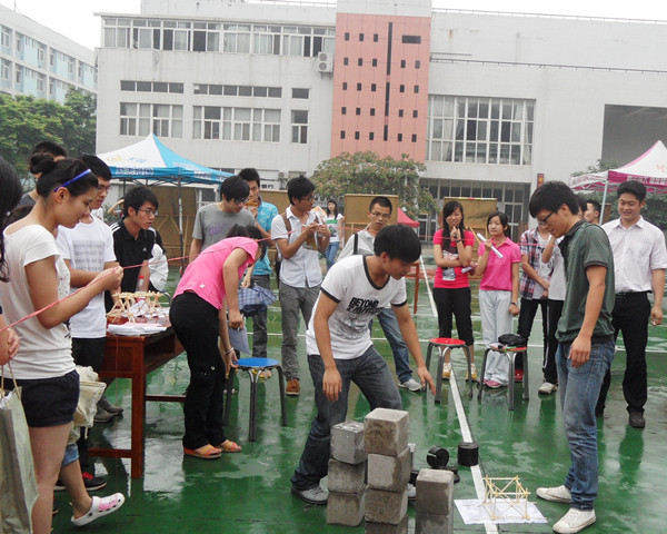 你能否想象一根筷子能承受多少重量?你又能否想象几十根筷子搭在一起又能承受多少重量?2012年6月4日中午12点20,由土木与建筑工程系团学联学习部主办的首届筷子搭桥承重大赛决赛在一食堂门口篮球场如期开展,虽然天空下着大雨,活动受到了很大影响,但选手和评委老师们却对活动表现出了极大的热情和支持,选手也在有限的环境下发挥出了极高的水平!