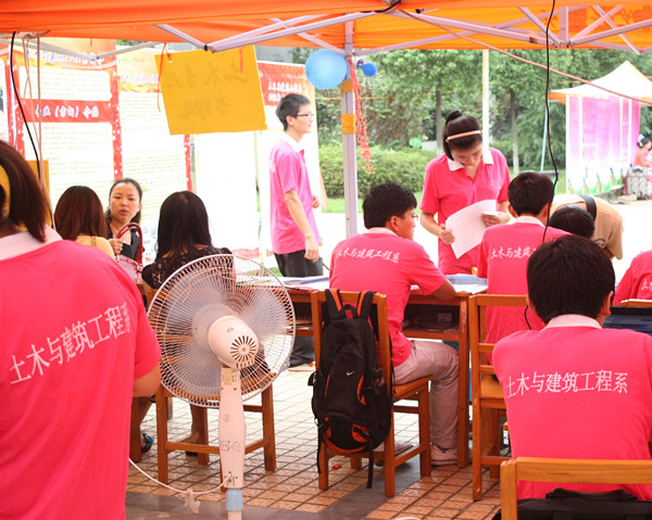 身着粉红色土木系系服的志愿者们活跃在校园各处,引领着土木系新学子完成报名的各项工作,同时为新成员们介绍着学校各处,以便更好地熟悉环境。“让爱心再飞一会儿。”飞扬着的爱心是土木学子对于新成员的热情与友好。志愿者们辛勤的劳动真真正正地让新成员感受到了家的温暖、大哥哥大姐姐的关怀。热情的介绍、关心的帮助、礼貌的话语,这就是土木系志愿者的风采、这就是土木系学生的热情与关心。