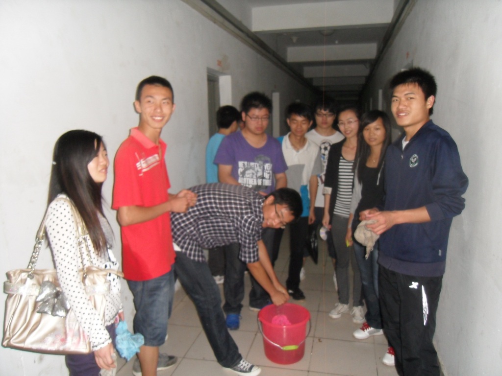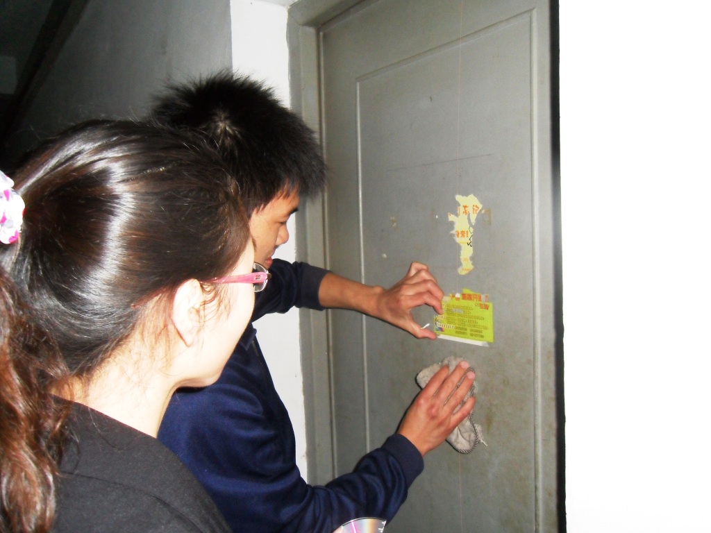 其次,同学们围绕全心全意为人民服务组织讨论了社会实践活动的具体内容。5月25日晚上8点,全组成员相约在学院六号宿舍楼,开展了一场规模宏大的“除牛皮藓”活动。每位成员都手拿小刀、抹布、小铲子等各种工具,在六号楼宿舍的墙壁上、楼道间以及寝室门口进行了“大扫除”,全体成员“奋战”了一个多小时,虽然过程辛苦劳累,却都始终面带笑容,为同学们有个干静整洁的生活学习环境尽一点微薄之力——累并快乐着。