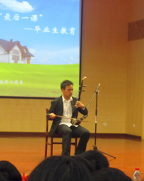 土木系党总支书记陈伟书记首先上台发言,陈书记在感人深切的发言中,从工作、安全、生活三大方面向08级毕业生给出了建议与期盼。就像每星期的晚点名一样,陈书记的话语中充斥着对学子的深深关心与浓浓情感,从细小的方面叮咛着08级学子。其后,优秀毕业生代表王海荣上台发言。她在发言中提到,大学生活已经结束,但我们求知的生涯还远远没有结束,青春是一种境界,拥有着青春的我们,不应将青春来挥霍,而应去拼搏、去奋斗。青春给予我们的是勇敢与动力,而不是任意挥霍的时光。接着由08级学生演唱的《明天会更好》更是将毕业课推向了高潮,是的,拼搏之后,明天会更好!之后雄浑激昂的二胡独奏“万马奔腾”作为课的结尾,带给大家的是热情、是拼搏。