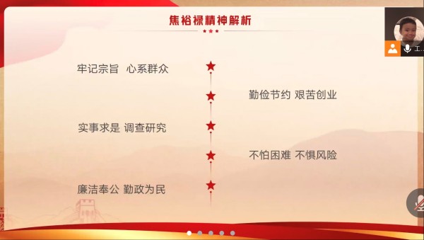 他将焦裕禄精神分为牢记宗旨、心系群众;勤俭节约、艰苦创业;实事求是、调查研究;不怕困难、不惧风险;廉洁奉公、勤政为民五个方面,加深了参会老师及同学对焦裕禄精神的深刻认识。