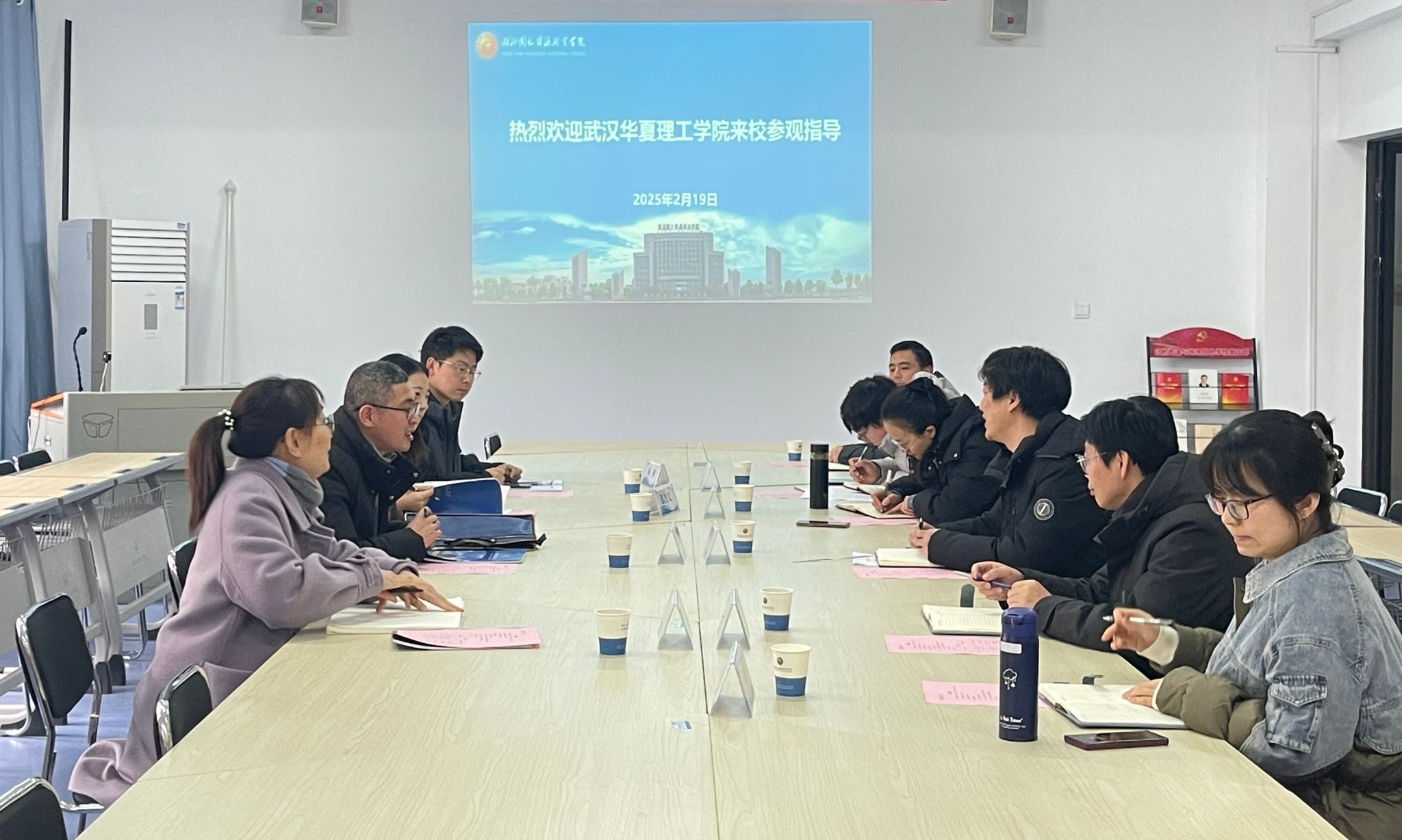 2025年2月19日下午,土木建筑工程学院党总支副书记郝志康、副院长朱韶茹、城乡规划专业负责人张力文、学工办主任兼党总支组织员杨柳一行四人访问了湖北国土资源职业学院。湖北国土资源职业学院自然资源与地理信息学院书记、院长姚先文、副院长崔红超以及各专业负责人参与了座谈。
