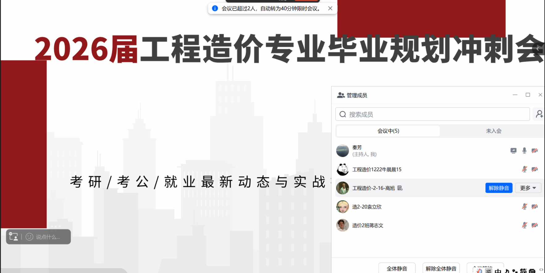 此次会议的成功举办,为2026届工程造价专业毕业生提供了宝贵的参考信息和清晰的行动框架,帮助同学们在毕业季来临之际,更加从容、高效地规划未来,为即将到来的职业或学业新征程做好充分准备。
