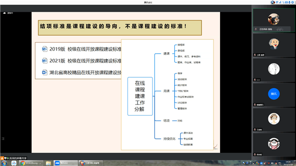 作为省级线上线下混合式一流课程《工程项目管理》负责人,杨易副院长对在线课程建设有着自己的理解。“校级在线课程大概干些啥?”、“建课是基础——无框架,容易塌”、“建课是基础——视频资源搞得好,学生才不会跑”、“结项不是目的——解读结项标准”,这些生动直观的标题立即将与会老师带入培训主题。