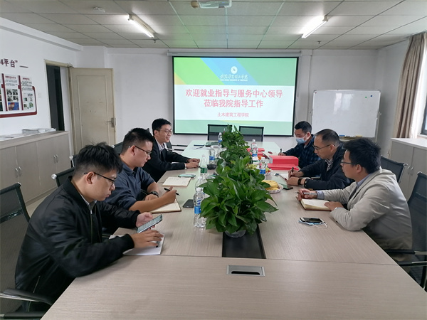 2021年10月29日下午3点,校就业服务中心李家梁主任、刘继平副主任和祝炜黎老师一行3人到土木建筑工程学院进行就业考核。党总支书记毛峥毅、党总支秘书吴振琦、学工办主任潘晶和毕业班辅导员吴乐、杨柳参与接待。