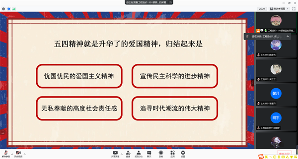 主讲人郭茜蕊从五四精神基本概述、五四运动历史起源、研究学习五四精神、马克思主义历史起源、马克思主义传入中国、立足现在展望未来这几个方面对五四运动和马克思主义在中国的传播展开讲述,并在中间穿插视频进行详细讲解。