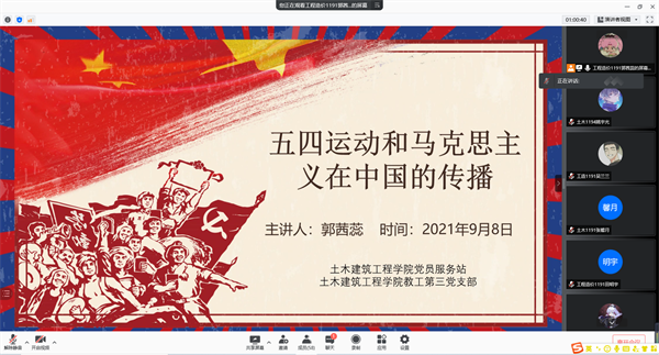 2021年9月8日下午六点,土木建筑工程学院党员服务站在腾讯会议上组织开展党史主题教育活动。会议由党员服务站站长郭茜蕊主持,所有党员和发展对象参加。