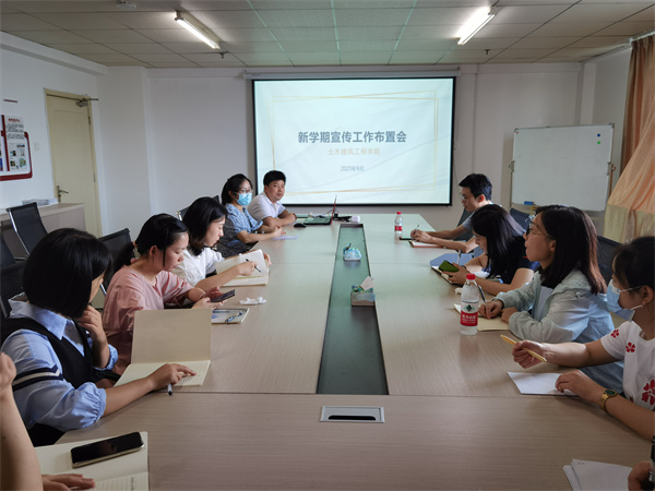 2021年8月31日中午12点半,土木建筑工程学院在综合楼1021会议室召开新学期宣传工作布置会,会议由党总支秘书吴振琦主持,党总支书记毛峥毅、教学行政办主任袁健和各系部宣传联络员参加。