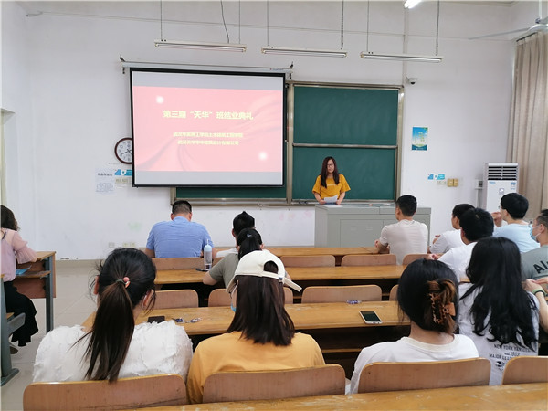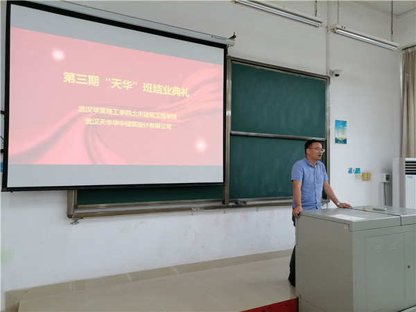 2021年6月21日下午4点半,由武汉天华华中建筑设计有限公司与土木建筑工程学院共同举办的第三期“天华”班在1-104教室举行了结业典礼。典礼由党总支秘书吴振琦主持,武汉天华华中建筑设计有限公司装配所所长邵宇、校企合作负责人王巍环、土建学院副院长杨易、2018级辅导员兼天华班班主任张磊和天华班学员参加。
