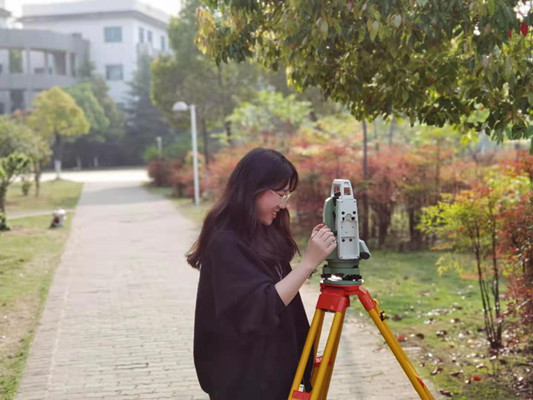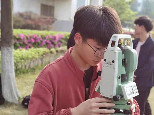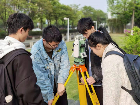 近日雨水收敛,天气晴好,土木工程系朱韶茹和李林森两位老师在校园里指导学生们进行测量实习。