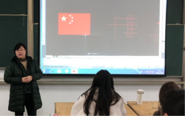“你们知道五星红旗的规定画法吗?你们理解五星红旗规定画法的含义吗?”何老师一连提出了三个问题。有同学说,可以上百度去查,“当然可以上百度查,但是作为一个中国人,你们应该清楚地知道祖国五星红旗的画法,更应该能感受到五星红旗的内涵。”何老师在PPT上展示出一面鲜艳的五星红旗,“比如,每当奥运赛场上升起五星红旗时,我们都会非常激动和骄傲,同时我们还应该感受到五星红旗的内涵。五星红旗的旗面是红色的,象征革命,象征着无数革命先烈鲜血染红,黄色象征光明,五角星用黄色,表现出红色土地希望的光明。”