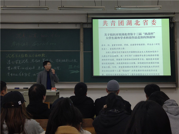 近期,土木建筑工程学院举行《湖北省第十三届“挑战杯”大学生课外学术科技作品竞赛》动员大会由各年级辅导员主持在教学楼不同教室分别举行,参加本次动员大会的有全院辅导员及全院学生。