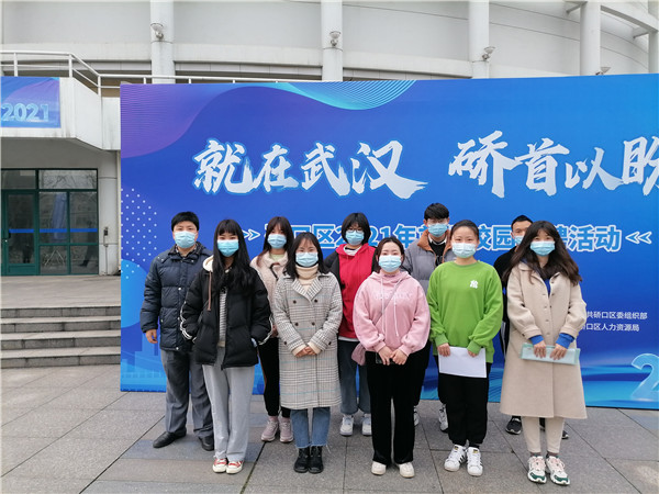 2021年3月10日上午9点,土木建筑工程学院党总支秘书吴振琦带领毕业生到中南财经政法大学(南湖校区)艺体中心参加“就在武汉·硚首以盼”——“学子留汉”工程硚口区2021年春季校园招聘活动。
