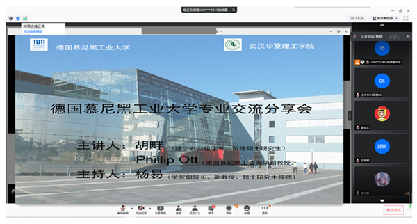 2020年12月25日下午1时整,土木建筑工程学院在腾讯会议上举行德国慕尼黑工业大学专业交流分享会。活动邀请德国慕尼黑工业大学副教授Phillip Ott以及我院建工2122级学长、留德硕士研究生胡畔担任主讲人,由学院副院长杨易主持,院团总支副书记王磊老师、2020级学生代表参加。