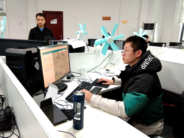 进入项目部,办公室内宽敞明亮,学生们每人一个工位,有条不紊地在电脑前工作。据悉,此次黄陂项目部的主要工作是进行土地房屋确权,学生部分时间去现场测量面积,部分时间在室内用电脑录取和处理数据信息。学生们反映,虽然工作强度较高,但是都能胜任,并且收获颇丰。
