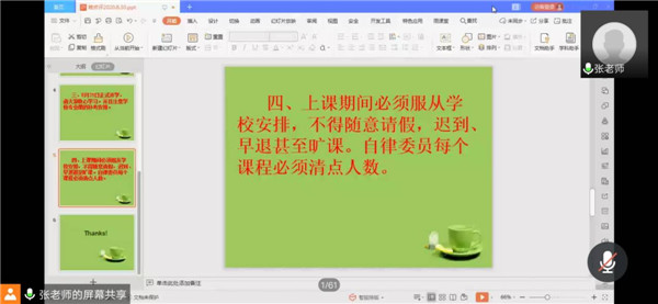 会议开始,为了同学们的生命安全和身体健康,老师们再三强调要遵守学校封闭式管理的规定,不能私自外出,要积极参与学校疫情防控的有关活动,做好个人安全防护。同时,辅导员要求班委带头引导本班同学,做好组织管理工作,做好每日体温数据统计和上报,督促班级同学及时上报信息。老师们还介绍了新学期选修课的设置和重要性,通报了开学第一周补考的相关安排。8月31日就要开始上课,老师们希望同学调整状态,尽快适应由网课到线下上课的转变,制定周密的学习计划,充分利用课余时间给自己“充好电”。