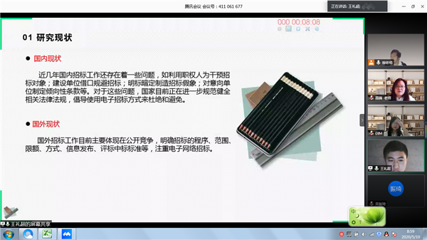 本次答辩采取以腾讯会议软件作为平台,进行网络答辩。答辩前,学生已完成毕业设计(论文)查重工作,经指导老师确认后并填写《毕业设计(论文)评分手册》电子版,通过答辩申请。所有参与的毕业生均需熟练掌握腾讯会议平台相关操作技能。
