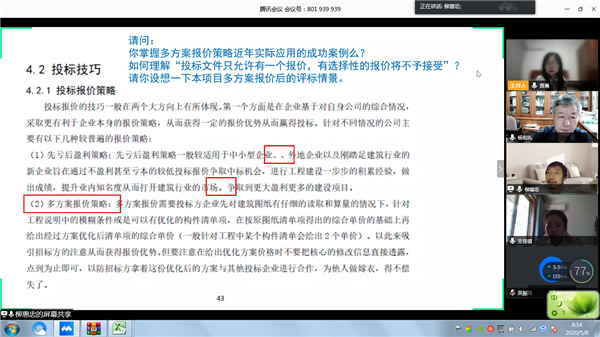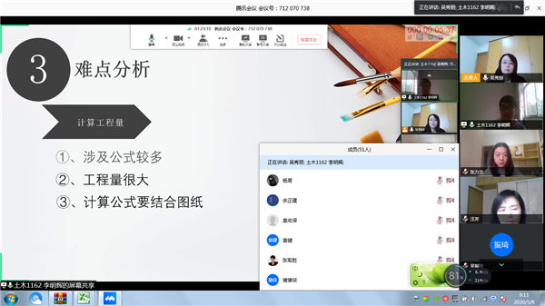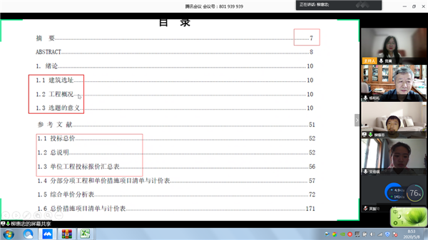 2020年5月8日上午8点半,土木建筑工程学院通过腾讯会议平台举行2020届优秀毕业设计(论文)答辩。答辩分别由学院院长杨和礼教授和土木工程系主任吴秀丽主持,汪芳、张力文、王爰瑗、柳惠忠、黄晨、阳桥等老师参加。分两组进行,第一组负责土木工程和城乡规划专业、第二组负责工程管理和工程造价专业,学院副院长杨易、教学办主任袁健、学校督导余正建老师应邀出席,数十名非毕业班学生进入会场旁听学习。
