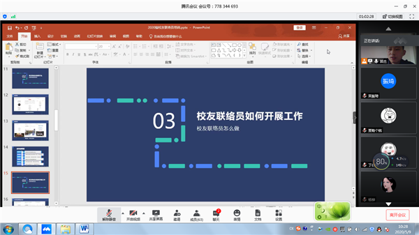 会上,郭主任介绍了学校校友会在平时特别是疫情期间开展工作的情况,对校友会的组织架构、工作人员、负责老师、联系方式、管理流程、换届选举、活动开展等各类事项作了说明。他针对校友工作中可能会遇到的问题作了解答,同时,他就学校建立的校友总会和武汉、宜昌、广东、浙江、上海等校友分会情况作了详细阐述,他希望新一届毕业生中的校友联络员能承担起沟通的责任,在校友和学校之间架起交流的桥梁。武汉校友分会的会长朱中卫同学也做了精彩发言,总结了武汉校友分会开展的活动和各项工作,对学弟学妹的加入表示欢迎,鼓励大家积极参与,为校友会做出贡献。