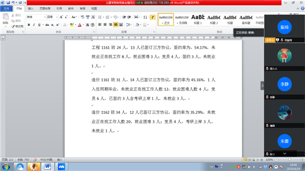 2020年4月24日晚上7点半,土木建筑工程学院通过腾讯会议平台召开全院教师大会,布置就业等工作事宜。会议由党总支书记陈伟主持,院长杨和礼教授、副院长杨易、院长助理张城芳、各系部及职能部门负责人和全体教师参加。