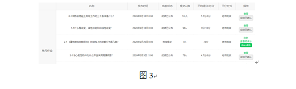 ③MOOC平台上课,发布课后作业,学生在规定时间内把做好的作业提交至平台。超过时间提交不了并会受到相应惩罚(无成绩),平台上改作业,在规定的时间内发布作业成绩,学生在网上可直接查询作业得分(图3)。