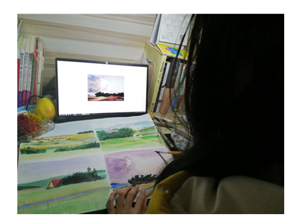 在课堂上,吴老师每次都精神熠熠,情绪饱满。她语气平和,耐心细致地结合现今的疫情和人物进行介绍,彰显了人文情怀。第一次上课介绍水彩画时,她重点分享了湖北美术学院刘寿祥老师的作品,刘老师不久前因新冠肺炎去世,是湖北省水彩绘画界的代表人物,多次获得各类大奖,其作品《冬花》、《细雨润无声》等自然、和谐,富有生命气息,给人带来心灵的慰藉。吴老师让每位学生选择一幅大师的作品,体悟其特点,做构图、色彩和创作手法上的分析。