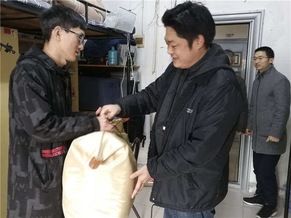 丁校长一行分别前往新生和老生所在的宿舍楼,慰问了土木1182班蒋本鑫等10名同学。领导们与学生亲切交谈,仔细询问他们的日常生活、复习备考及春节返乡车票购买情况。在了解到他们的现实状况后,勉励他们要克服困难,努力进取,学好专业知识,学校和学院会给予他们相应的帮助;同时叮嘱他们要正视困难,自强不息,始终保持阳光向上的品质,努力学习,奋发图强,不断用知识充实自己,早日成为社会栋梁之才,回报父母、回报社会。