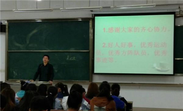 最后,辅导员对此次运动会进行了总结,土建学院在本次运动会中创造历史离不开赛场上拼尽全力的每位同学,离不开场内外忙前忙后的工作人员,离不开看台上呐喊助威的观众,辅导员指出,在此次运动会中看到了同学们的团结一致,相信通过此次运动会能够加强班级及同学之间的凝聚力。