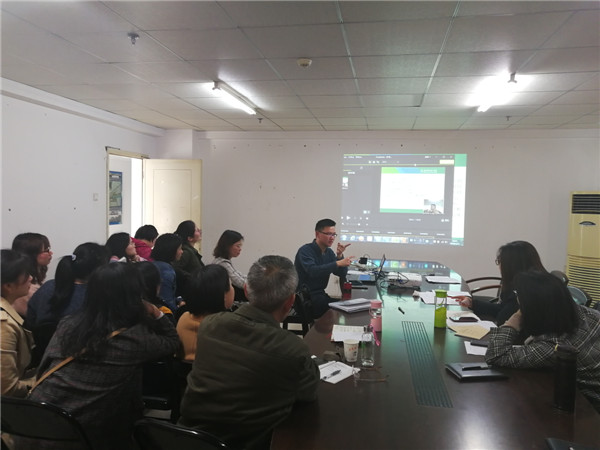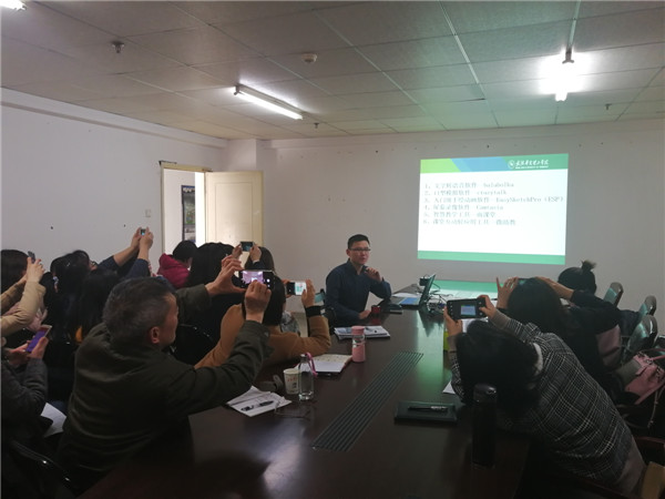 杨易老师从“超星学习通”APP的资源、模式、使用方法等方面,向全体老师全面介绍了“超星学习通”的优点和未来信息化教育教学发展趋势,她指出,“学习通”可以自助完成图书馆藏书借阅查询、电子资源搜索下载、学习学校专业课程、定做教学PPT、进行小组讨论等多项功能,是一个集办公、教学、学习于一体的实用性APP。她现场演示了在线课程的建立、设计、考勤、作业、考核等各个环节的操作步骤,利用课堂案例进行系统的介绍。