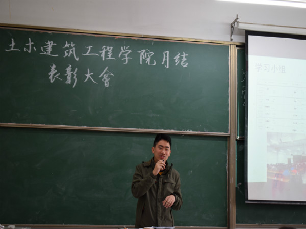 大会最后,国家奖学金获得者土木1138班张强上台分享了他学习生活中的心得,强调了平常多读书重要性,并为我们介绍了时间管理的方法。希望同学们能严格要求自身,让自己全方面得到提升,他笑着对同学们说到。